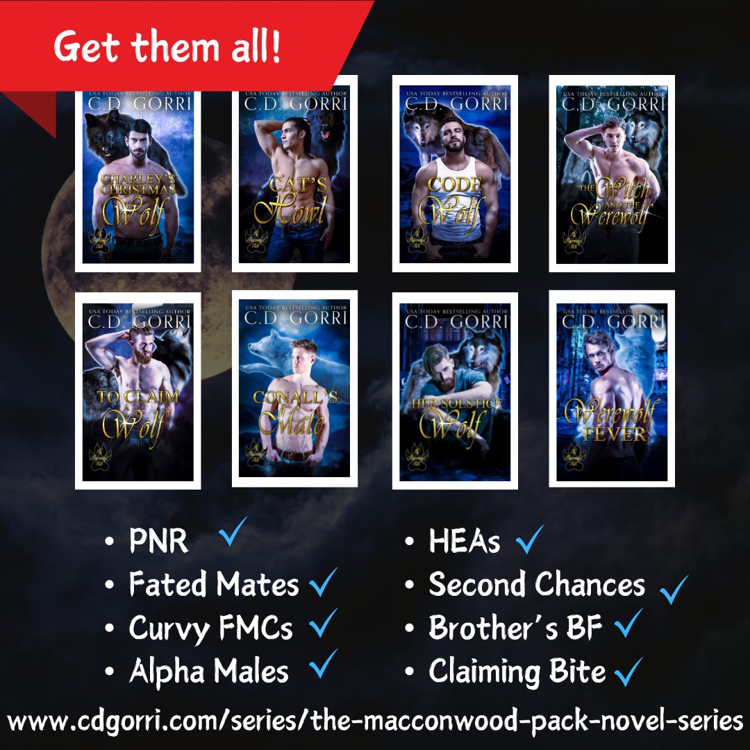 Read more here https://www.cdgorri.com/books/cats-howl and get 50% off with coupon code KXFGJMHJ (Coupon is good for any of the Macconwood Pack Novel Series books through Nov 30th)